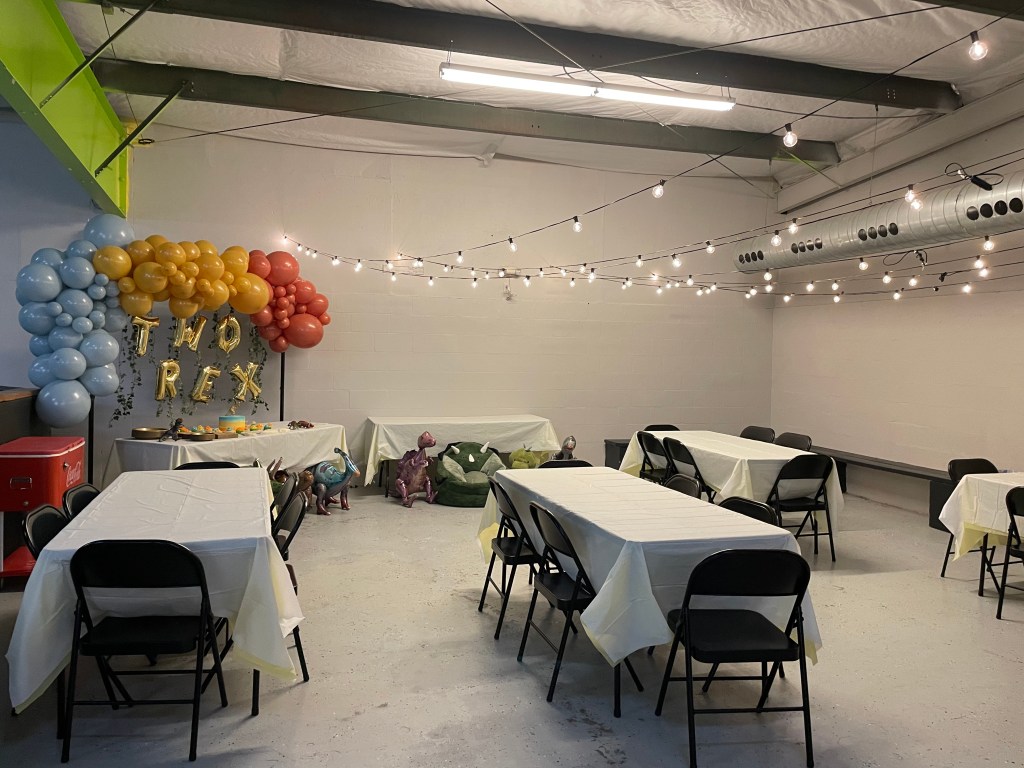 We provide two six foot rectangular tables for cake and presents and four rectangular tables and chairs for people to eat at,cooler for drinks ( you provide drinks and ice), and clean up service. You may bring in food of your choice.